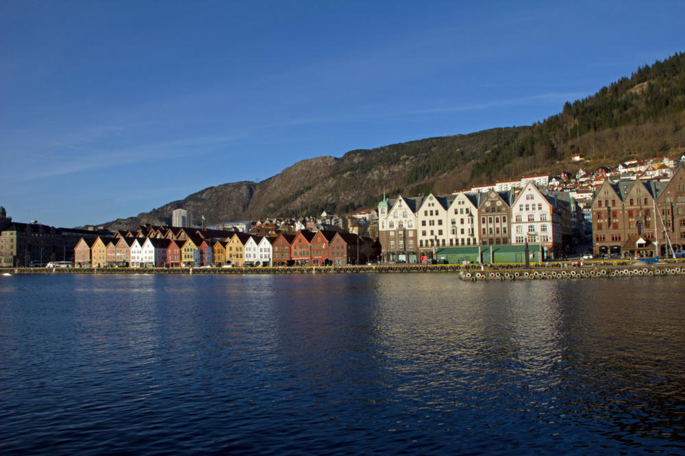 Nach einer Zwischenlandung in Amsterdam landen wir gegen 16 Uhr in Bergen. Schon die ersten Blicke aus dem Flugzeug auf die zerklüftete Fjordlandschaft machen Lust auf mehr. Außerdem werden wir von einem stahlblauen Himmel empfangen, was für Bergen sehr untypisch ist. Sie gilt als eine der regenreichsten Städte Europas mit durchschnittlich 248 Regentagen im Jahr.