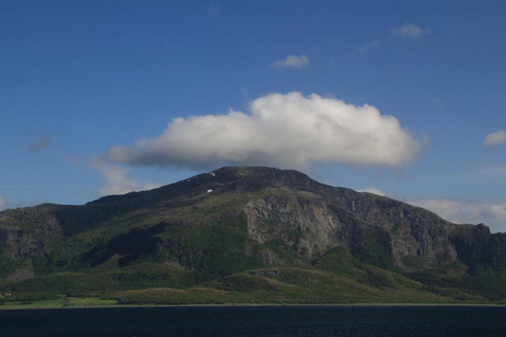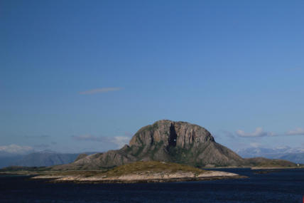 Um 17:45 Uhr erreichen wir den Torghatten bei bestem Wetter. So fährt der Kapitän eine kleine Schleife, damit wir den Berg mit dem Loch von allen Seiten gut beobachten und fotografieren können. Das Loch im Berg ist 160 m tief, 35 m hoch und 15 m breit.