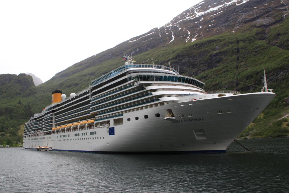 Als wir in Geiranger ankommen, werden wir von der MS Astor und der Costa Luminosa empfangen. Die Astor ist rund 176 m, die Costa Luminosa 294 m und unsere FINNMARKEN 139 m lang.