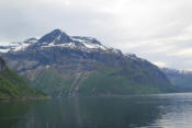 Fahrt zum Geirangerfjord Um 9:30 Uhr setzen wir die Fahrt Richtung Geirangerfjord fort. Wir sind schon ganz gespannt, weil der Geiranger nur im Sommer angefahren wird und wir ihn deshalb von unserer ersten Reise noch nicht kennen. Je mehr wir uns Geiranger nähern, desto mehr zieht sich leider der Himmel zu. In Geiranger gibt es sogar ein paar Spritzer Regen. Aber egal. Wir jammern auf sehr hohem Niveau, insofern machen uns die paar Tropfen nichts aus.