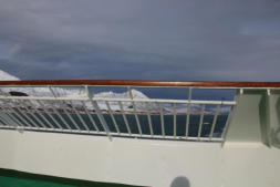 RisøyrennaDie Risøyrenna ist 4,85 km lang, 6 m tief und etwa 50 m breit. Es handelt sich um die einzige künstlich geschaffene Fahrrinne auf der Hurtigrutenstrecke. Wir erleben die Passage vorne auf Deck 5. Der Wind hebt uns fast aus den Schuhen. Wir haben Mühe, uns auf den Beinen zu halten. Nach der Passage müssen wir uns erstmal aufwärmen.