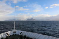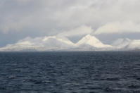 Fahrt nach Finnsnes und Tromsø Heute wachen wir um 7:30 Uhr in Harstad auf. Im Hafen liegt noch die MS TROLLFJORD und die KONG HARALD kommt während unseres Frühstücks auch in Harstad an. Irgendetwas stimmt daran nicht, weil 3 Schiffe gleichzeitig an einem Ort gibt es eigentlich nicht. Später erfahren wir, dass die TROLLFJORD einen Maschinenschaden hat und auf ein Ersatzteil wartet. Wir setzen unsere Fahrt Richtung Finnsnes fort und verbringen die meiste Zeit draußen auf Deck 5. Das Wetter ist wie immer auf dieser Reise sehr wechselhaft. Aus dem Nichts tauchen auf einmal regelrechte Schneewalzen auf, die auch genauso schnell wieder verschwinden. Einfach faszinierend.