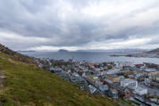 Hammerfest Heute ist das Wetter leider stark bewölkt, aber wenigstens trocken. Tone, die Leiterin unseres Expeditionsteams, lädt um 9:30 Uhr in den Konferenzsaal ein. Sie stellt die Fram-Expeditionen von Amundsen etc. schauspielerisch nach. Das zieht sich etwas in die Länge, ist aber eine ganz nette Abwechslung. Zumal das Wetter und die Landschaft heute vormittag nicht so spektakulär sind. Um 11:10 Uhr erreichen wir Hammerfest mit fast 30 Minuten Verspätung. Wir besteigen über den Zick-Zack-Weg den Hausberg Salen. Letztes Jahr haben wir auf halber Strecke abgebrochen, wegen des hohen Schnees. Von oben hat man eine tolle Aussicht. Nach dem Abstieg gehen wir zur Hammerfestkirke und dann kurz in den Eisbärenclub.
