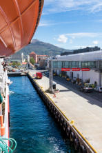 Auch am letzten Tag an Bord stehen wir früh auf. Wie immer bringt dieser Tag eine komische Gefühlslage mit sich. Die Koffer sind weitestgehend gepackt und wir werden wehmütig, dass die Reise in wenigen Stunden schon wieder Geschichte sein wird. Auf dem ganzen Schiff herrscht eine leicht gedrückte Stimmung. Dennoch wollen wir die Zeit bis Bergen natürlich nochmal genießen. Und das Wetter trägt seinen Teil dazu bei. In Florø gibt es einen Sonnen-Wolkenmix und die Temperatur ist auch auf einem guten Weg. Für Bergen erwarten wir sommerliche Werte mit um die 23°. Das wird eine ganz schöne Umstellung nach dieser “Winterreise” mit Temperaturen um den Gefrierpunkt.