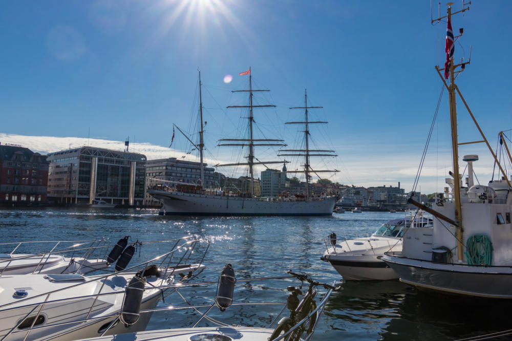 Auf die Minute pünktlich laufen wir bei allerbestem Wetter in Bergen ein. Auch zwei Kreuzfahrtschiffe sind schon da.