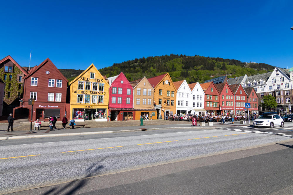 Die schon tief stehende Sonne taucht Bryggen in besonderes Licht.