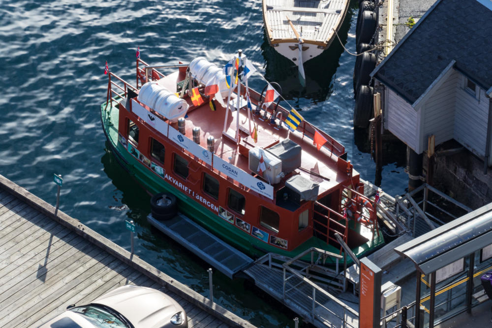 Wie immer erfolgt das Aussteigen deckweise von oben nach unten, damit es am Kofferband keinen Stau gibt. Und auch wie immer sind gefühlt die ersten 200 Passagiere auf Deck 6 untergebracht gewesen und ver- lassen als erste das Schiff. Mit dem Ergebnis, dass es sich natürlich am Kofferband im Terminal staut. Dieses Phänomen ist offensichtlich international gängige Praxis. Man verbringt 11 Tage einen entschleunigenden Urlaub an Bord und kann es dann nicht erwarten, als erster von Bord zu gehen. Ich verstehe es einfach nicht. Aber egal. Irgendwann kommen auch unsere Koffer und wir entern den Transferbus zu unserem Hotel Clarion Admiral. Wir freuen uns schon sehr auf dieses tolle Hotel, in dem wir auch 2013 schon mal gewohnt haben. Dort angekommen checken wir ein, beziehen unser Zimmer 502 im Dachgeschoss und machen uns auf den kurzen Weg zum Fischmarkt. Von dort fährt der Bus zum Ulriken ( inkl. Seilbahn kostet es 280 NOK p.P. ).