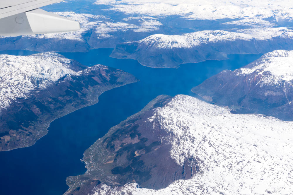 Vom Rathaus gehen wir dann langsam zum Hotel zurück, um unsere Koffer zu holen. Nachdem das Wetter morgens noch diesig und relativ kühl war, ist es jetzt wieder top. Um 12:05 Uhr nehmen wir den Bus zum Flughafen und um 14:45 Uhr das Flugzeug nach Bergen. Der Flug dauert nur eine gute halbe Stunde, ist aber traumhaft schön. Wir fliegen über schneebedeckte Landschaft, vermutlich Teile der Hardangervidda. Die Fjorde bei diesem Wetter aus der Luft zu bewundern ist einfach ein Traum.