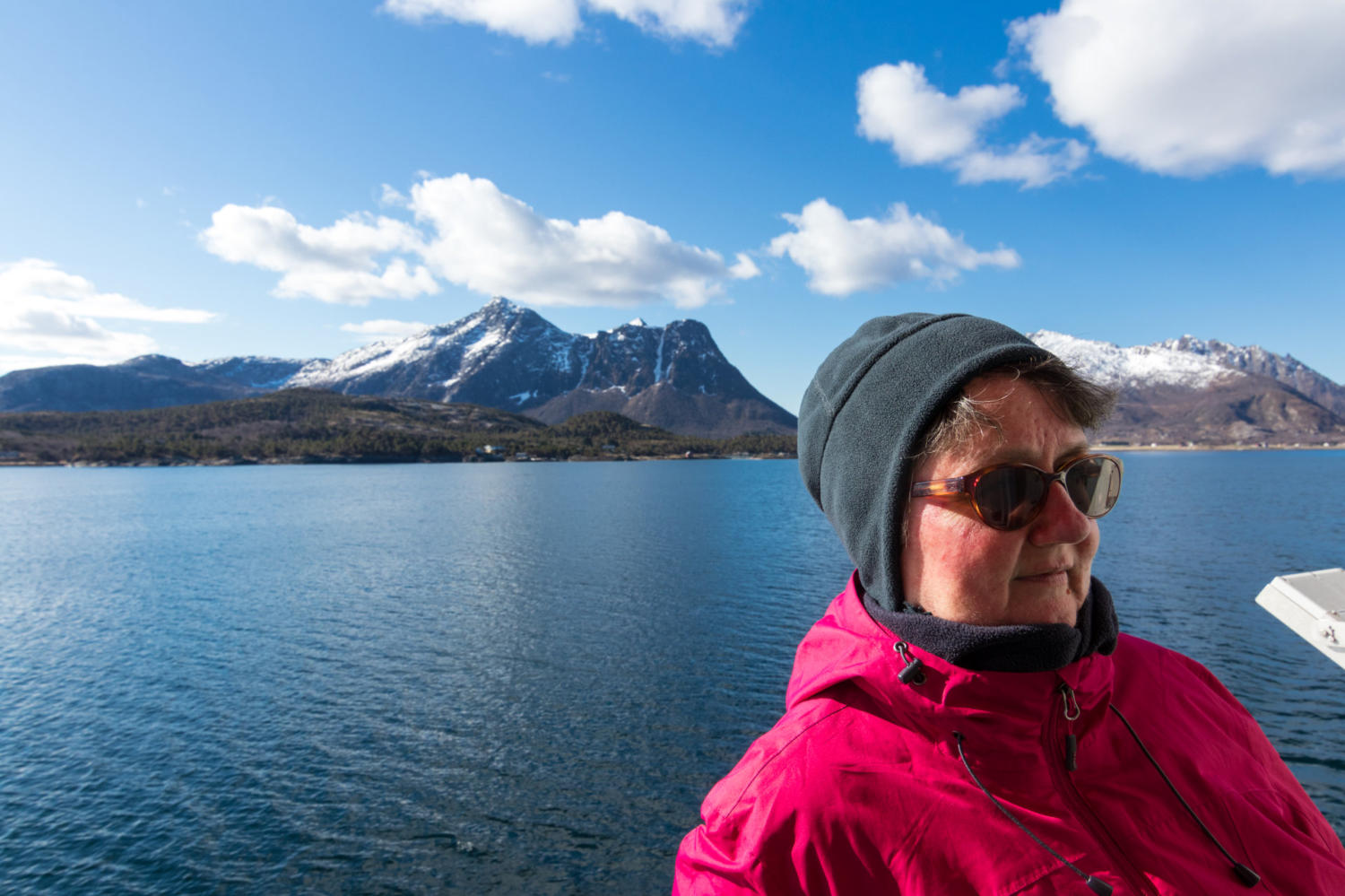 Um 10:10 Uhr sind wir in Ørnes und kurz darauf startet die Polarkreistaufe. Eine Schwedin vertippt sich nur um 10 Sekunden, sodass sie die vom Kapitän unterschriebene HR-Flagge der letzten Reise bekommt. Außerdem wird sie als erste Passagierin getauft.