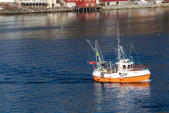 Die Orte Kjøllefjord und Mehamn bedienen wieder mal alle Klischees von norwegischen Dörfern. Die mittlerweile tiefer stehende Sonne taucht die Orte in ganz tolles Licht. Abends gibt es das traditionelle Nordkapbuffet mit Königskrabben, Crevetten, Lachs und allen möglichen anderen Meeresbewohnern. In Berlevåg gehe ich nochmal raus, weil es hier eigentlich die Begegnung mit der MS SPITSBERGEN geben soll. Aber leider kommt sie nicht. Wenigstens gibt's mal wieder einen tollen Sonnenuntergang.