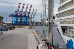 Der Start am 7.9. ist leider etwas holprig, da ausgerechnet der Wagon mit unseren reservierten Plätzen heute fehlt.Also müssen wir in einem anderen Platz nehmen, was glücklicherweise kein Problem ist, da noch genügend freie Plätze vorhanden sind. Na ja, das sollte das einzige kleine Problem während der Reise sein. Also Schwamm drüber.Gegen 13 Uhr erreichen wir Hamburg, geben unsere Koffer am Bahnhof bei der bereitstehenden AIDA-Crew ab und fahren mit dem Shuttlebus zum Cruiseterminal nach Steinwerder. Ich wusste bis dato gar nicht, dass es mitten im Containerhafen auch noch ein Terminal für Kreuzfahrtschiffe gibt. Das Einchecken verläuft wie immer zügig und unkompliziert, sodass wir kurz nach 14 Uhr auf dem Schiff sind. Da das Auslaufen erst um 18 Uhr ansteht, haben wir genug Zeit zum Essen, Koffer auspacken und einen Rundgang durchs Schiff.